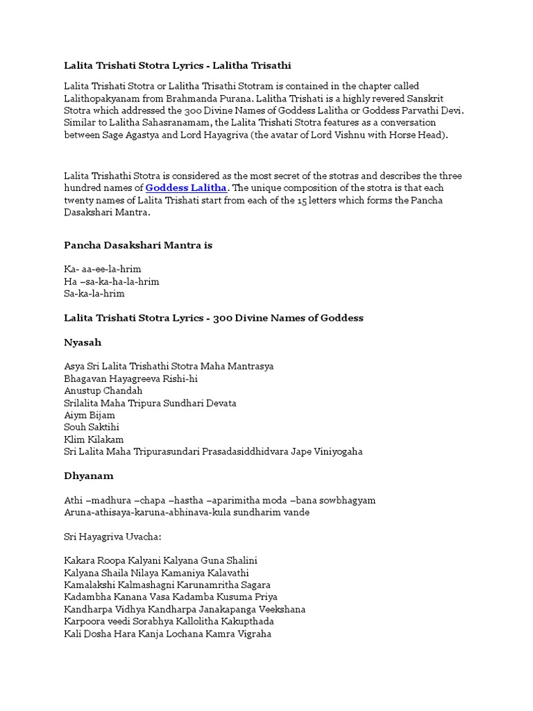 Sri Lalitha Sahasranamam Tamil Lyrics Sri Lalita Trishati Stotram Sri Lalita Trishati Stotram Author Created Date 10 20 2007 6 34 25 Pm Sree Vishnu Sahasranamam Home 20vishnu 20sahasranama - Read and listen to the powerful lalitha trishati stotram through this app.